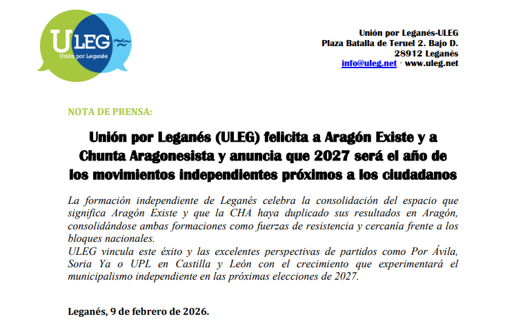 Unión por Leganés (ULEG), partido independiente que ostenta actualmente la primera tenencia de alcaldía en el Gobierno de Leganés, ha querido trasladar su más sincera felicitación tanto a Aragón Existe como a Chunta Aragonesista (CHA) por los buenos resultados obtenidos en las elecciones a las Cortes de Aragón celebradas ayer, 8 de febrero de 2026.